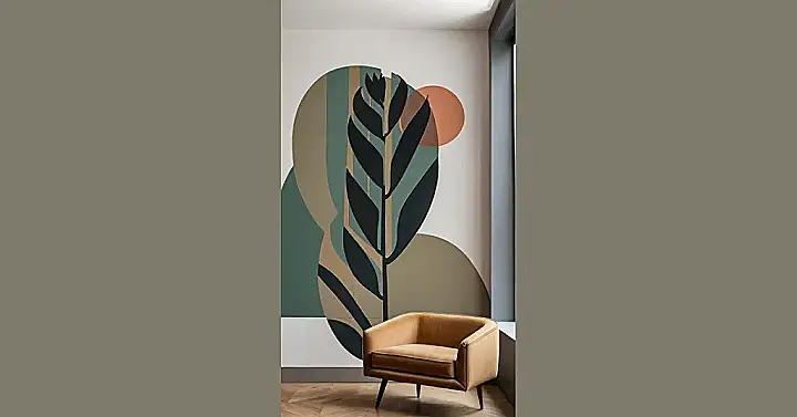 That’s not just a wall, that’s a masterpiece! Check out this amazing wall decor – it’s like a modern botanical garden exploded with colour and shapes all over the wall! Imagine a super chill plant life decided to hang out on your wall, got a little artsy, and added some funky circles and calming earth tones. It’s the perfect way to add some personality to any room without screaming for attention, just a sophisticated whisper of style.