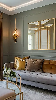 This room is seriously stylish! Just look at that gorgeous, glam mirror—it’s like a portal to another fancy room! And the wall color? Perfect! It’s a sophisticated grey that makes all the gold accents pop. The whole thing is like a super-chic living room from a magazine, and it just screams “wall decor goals.” It makes you want to ditch your old posters and get some seriously cool stuff for your own walls!