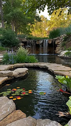 Imagine this: you’re a tiny frog, hopping from lily pad to lily pad in a sparkling pond. The water’s so clear you can almost see your reflection, and colorful lily pads float lazily on the surface. This isn’t just any pond, though – it’s a mini-waterfall paradise! A cute little cascade tumbles down mossy rocks, creating a soothing sound that’s perfect for a peaceful afternoon. It’s like having your own private, ridiculously charming house pond, complete with a small garden bursting with green plants. Who needs a giant swimming pool when you’ve got this?