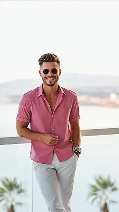 Alright, picture this: You’ve survived another week of school, and it’s finally the weekend! This dude in the photo totally gets it. His relaxed coral-colored shirt and those clean white pants scream, “I’m off duty, but I still look awesome.” Plus, the sunglasses? They’re basically saying, “Bring on the sunshine (and zero homework)!” It’s the perfect mix of comfy and cool, proving you can look put-together without trying too hard.