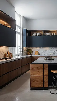 This kitchen is so stylish, it probably has its own Instagram account! Seriously, look at those sleek blue cabinets – they’re like the cool kids of the kitchen world. And that marble backsplash? It’s giving off major “I woke up like this” vibes. If your kitchen looked like this, you might actually *want* to do the dishes, or at least take some aesthetic photos next to the sink.
