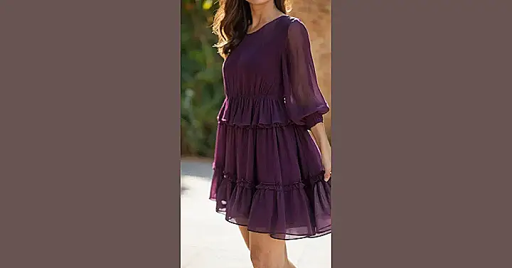 This dress is like a party for your wardrobe! It’s all about the ruffles, which make it look like you’re ready to twirl around and dance the day away. And that gorgeous purple color? It’s like a burst of sunshine on a cloudy day – super bright and cheerful. Even though the dress is a bit fancy, it still feels comfy and easy to wear. It’s like a big hug for your style!