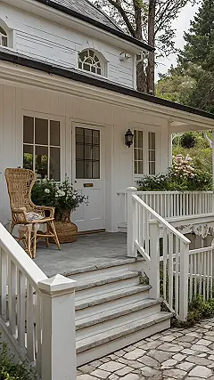 Look at that super comfy-looking chair on the porch! It basically screams, “Come sit here, tell me all your secrets, and maybe spill a little juice.” The steps leading up are practically rolling out a white carpet welcome. It’s the perfect spot for gossiping with friends, reading a good book (or scrolling TikTok, let’s be real), or just pretending you’re the main character in a cozy drama. This white cottage exterior is definitely giving off major “come on in, the water’s fine… wait, I mean the porch is comfy” energy.