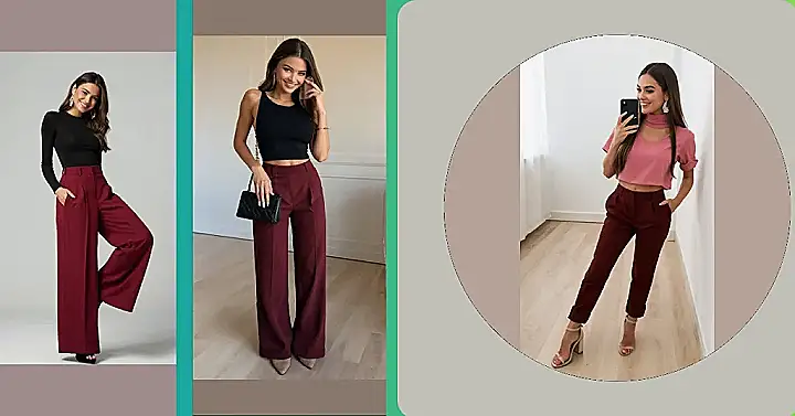 This image is all about how to rock those super stylish wine-colored pants! See that gorgeous model? She’s showing off two amazing ways to wear them – one with a sunshine-yellow top for a totally vibrant look, and another with a sophisticated burgundy blazer for a more grown-up vibe. It’s like a fashion chameleon – changing based on the top! Who knew wine-colored pants could be so versatile?