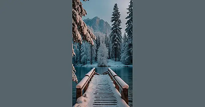 Okay, so picture this: you’re scrolling through Instagram and BAM! This pops up. It’s like a Disney movie, but without the singing animals (probably). Seriously though, the snow-covered trees and that mountain in the background make it look like the perfect place for a winter photoshoot. Just imagine the TikToks you could make! Just don’t trip on that dock, or you’ll be trending for the wrong reasons.