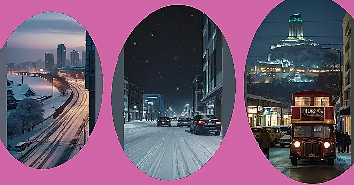 It’s almost magical, isn’t it? The city lights twinkle against the snowy landscape creating a soft glow. You can almost feel the cold, crisp air and hear the quiet crunch of snow underfoot. And that poor little car, all alone and stuck in the snow – looks like someone needs a push! It’s a reminder that even in a bustling city, winter still finds a way to add its own special, snowy kind of charm. It’s definitely a scene that makes you want to grab some hot cocoa and cozy up inside!
