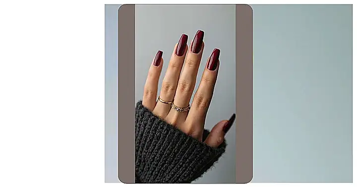 This picture is like a winter wonderland for your fingertips! Imagine cozying up in your favorite sweater (and it looks super comfy, by the way) on a chilly winter night, and then BAM! You see this gorgeous hand with its long, shiny, burgundy nails. Talk about a showstopper! It’s like the perfect winter accessory. Think of all the fun you’ll have showing off these nails with your friends – you’ll be the envy of all the other cool cats!
