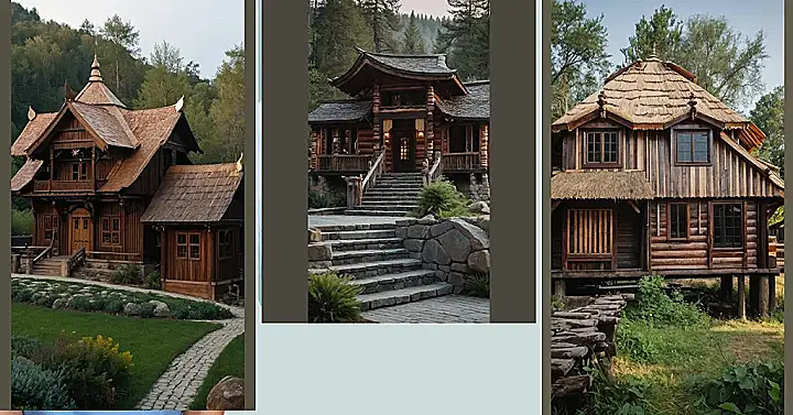 Imagine walking through a forest and stumbling upon this amazing house made entirely of wood! It’s like something out of a fairytale! The tall pointy roof and golden decorations give it a magical feel, and the surrounding trees make it feel like a secret hideaway. You’d probably want to spend the whole day exploring its nooks and crannies, right?