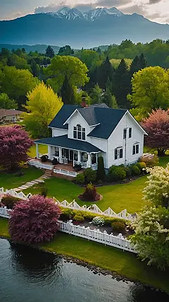 This picture is like a postcard from a dream vacation! The cute white house looks like it belongs in a fairy tale, with its big porch and those fancy windows. And just look at that view! You’ve got mountains in the background, all covered in snow. It’s like the mountains are saying “Hey! Come on up and play in the snow with us!” Plus, there’s a little pond right in front of the house. I bet you could spend hours just relaxing on that porch, watching the ducks swim around and enjoying the fresh air.