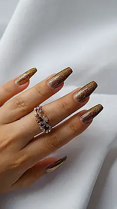These nails are like a warm hug on a chilly fall day! That glittery, golden shimmer reminds us of falling leaves and cozy sweaters. It’s the perfect look for a pumpkin spice latte and a trip to the apple orchard.