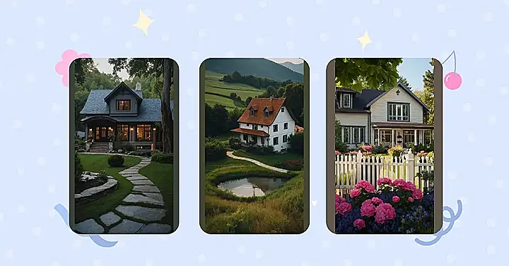 This house looks so cozy and inviting, it’s like stepping into a fairytale! The stone path winding through the lush green grass makes you feel like you’re on an adventure. Imagine walking up those steps, maybe with a basket full of yummy snacks, and getting ready to spend a night in this beautiful home. Maybe there’s a fireplace inside, and you can snuggle up with a good book and some hot cocoa.