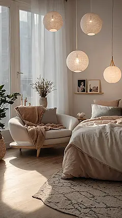 See that super comfy-looking chair by the window? That’s not just a chair; it’s a professional napping station, probably engineered by sleep wizards. It looks like it could literally hug you back while you read a book or just stare peacefully into the middle distance, perfecting the noble art of doing absolutely nothing. And those cool globe lights hanging from the ceiling? They’re basically setting the mood for maximum chill, making everything feel warm and soft, like a giant, cozy filter has been put on real life. Who needs a stressful day when you can just melt into this room?