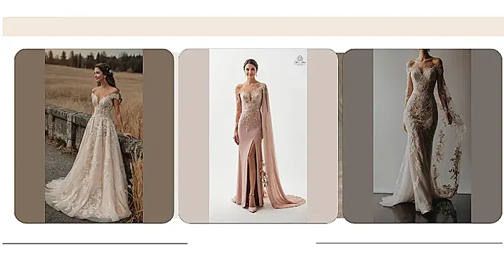 Talk about hitting the style jackpot! This amazing dress might not be made of solid gold, but it definitely gives off major ‘golden glow’ vibes, like the sunniest day ever decided to become a gown. With its beautiful lace details and those cool off-the-shoulder sleeves, it looks like something a queen would wear – a queen who knows how to have a good time, of course. It’s so stunning, you’d probably have to remind guests to actually look at the person wearing it, not just stare at the sheer awesomeness of the fabric!