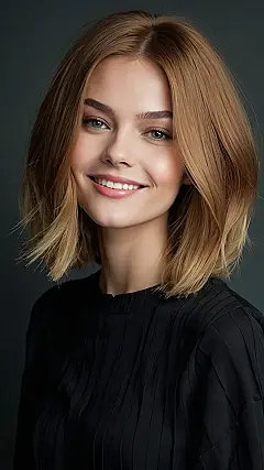This girl’s got a bob that’s totally on point! It’s shoulder-length, which is like the Goldilocks of haircuts – not too short, not too long, just right for showing off those gorgeous eyes and that amazing smile. Seriously, it’s the perfect frame for her awesome face, kind of like how a picture frame makes a masterpiece even better. And those warm, autumnal colors? They’re totally making the bob even more fabulous!