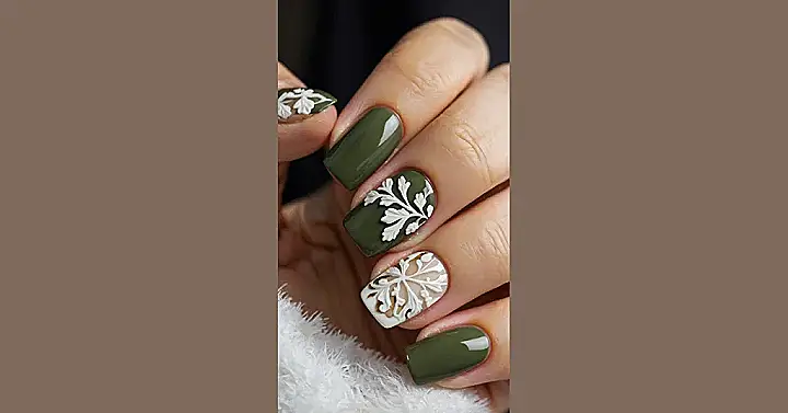 Forget pumpkin spice lattes, your nails are ready to steal the show this fall! Just look at these gorgeous fingertips rocking a deep, woodsy green – it’s like Mother Nature herself decided to give your hands a stylish makeover. You could almost blend in with a forest, or at least look super chic while trying to find the perfect autumn leaves for your aesthetic Instagram post. And those delicate white patterns? They’re basically tiny works of art, proving that even your nails can be gallery-worthy.