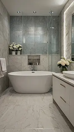 This bathroom proves that even a small space can feel like a luxurious spa! The sleek, white bathtub and stylish vanity give the room a clean, modern look, and the gorgeous marble tiles make it feel fancy—like a tiny palace for your bath time. Who needs a huge bathroom when you can have a beautifully designed mini-oasis? Those glass shower doors also help make the space feel even bigger than it actually is, a sneaky design trick that’s super effective!