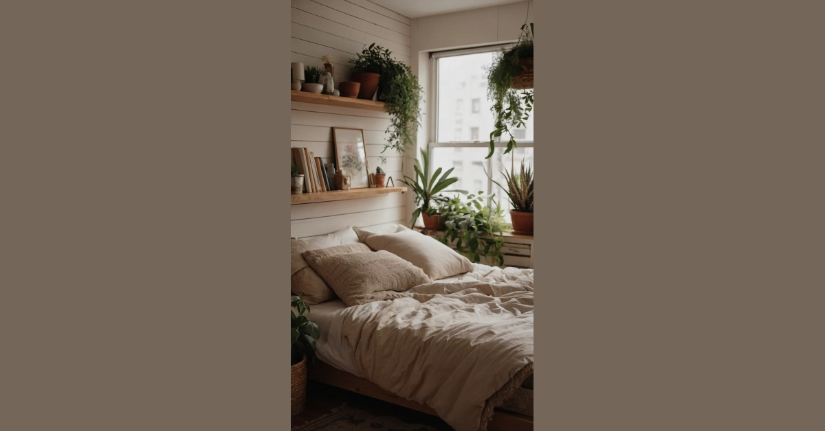 This bedroom is seriously goals! Imagine waking up in this super-chill space, surrounded by plants that are probably plotting world domination (but in a cute, leafy way). Those wooden shelves are like something out of a fairytale, perfectly holding everything from books (for when you need a break from plotting world domination yourself) to adorable little potted plants. It’s the perfect mix of organized and relaxed—like when you finally finish your homework and get to binge-watch your favorite show.