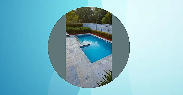 This isn’t your grandma’s pool! Look at this sparkling blue oasis – it’s like a mini-vacation in your own backyard. The cool, calming blue water is surrounded by fancy, multi-colored stone tiles that look like they’re straight out of a magazine. It’s the perfect spot to beat the summer heat and show off your amazing pool landscaping skills (or, you know, hire someone who has them!). The neat hedges and fence add a touch of elegance, creating a private paradise where you can totally relax and pretend you’re on a tropical island.