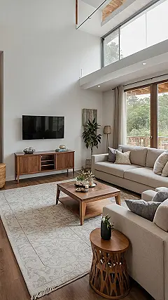And let’s talk about those smart style choices that make this small living room feel anything but cramped! That awesome rattan light hanging from the ceiling? It’s probably got a secret superpower to make the room feel taller and more open. Plus, notice how the TV console keeps things tidy and neat, hiding all those pesky cables and gadgets. It’s like the room knows your struggle with clutter! Everything from the cozy rug to that plush little pouf is designed to make a smaller space feel super inviting and ready for epic movie nights or just chilling out without feeling like you’re playing a game of Tetris with your furniture.