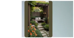 This little garden is bursting with life! It’s packed with so many different plants, it’s like a mini jungle right in your backyard. There are palm trees that look like they just stepped out of a tropical postcard, and tons of other interesting leafy friends. You can almost hear the sound of exotic birds chirping!