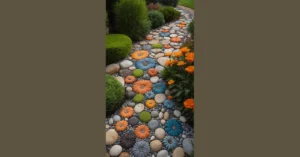 This picture is like a little slice of paradise right in your backyard! Imagine stepping onto the stone path and feeling the soft grass between your toes. The lush green plants, with their bright orange flowers, make you feel like you’ve been transported to a tropical island.