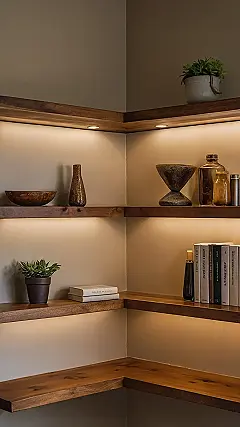 That tricky corner in your room, the one that usually just collects dust bunnies or gets ignored? It’s finally getting its moment in the spotlight, literally! These super cool corner shelves are like a magic trick for wasted space, turning a neglected angle into the coolest display zone. Check out how each shelf in the picture has its own little glow-up light, making everything from old books to a funky vase look like a museum exhibit. Who knew a corner could be so popular, or that simply adding these shelves could instantly upgrade your whole room’s vibe from “meh” to “marvelous”?