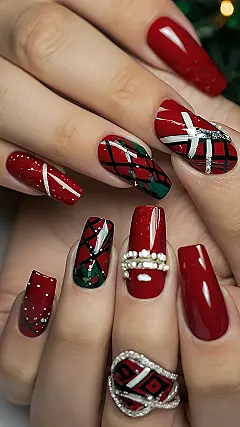 These nails are seriously festive! Look at those gorgeous red and green designs – they’re like tiny, sparkly Christmas presents on your fingertips! It’s like someone took a holiday sweater and shrunk it down to nail size. Perfect for all those holiday parties, and way more fun than plain red nails. You could totally rock these to your winter formal or even just hang out with friends!