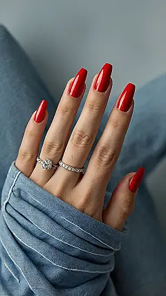 Get ready to kick off 2026 with a bang because these fiery red nails are practically a party waiting to happen! Just look at that amazing shine and fierce coffin shape – they’re totally channeling main character energy for your New Year’s celebrations. You’ll be clinking glasses with your friends (sparkling cider, of course!) or waving your hands around excitedly when the clock strikes midnight. These nails are so bold, they might just convince everyone you’ve secretly been a super spy all along, ready for any adventure 2026 throws your way. Plus, they look fantastic peeking out from a cool denim sleeve, adding a little extra sparkle to whatever comfy outfit you choose.