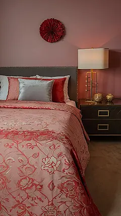 And can we talk about that artwork? It’s like a secret garden blooming in shades of crimson and maroon. Plus, with all that red, this room screams “romantic date night,” without being too over-the-top. It’s the perfect balance of cozy, stylish, and just plain fun – kind of like a really awesome, luxurious slumber party.