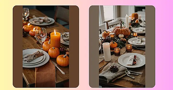 Imagine this: you’re sitting at a rustic wooden table, surrounded by the warm colors of fall. The leaves are turning golden and red, and the air is crisp. In front of you, a big, juicy pumpkin sits proudly next to a smaller one, like a pumpkin family enjoying a delicious dinner. There are candles burning, and the whole scene is glowing with a cozy, inviting charm. It’s a perfect picture of fall dining, and it makes you feel warm and fuzzy inside, even if you haven’t had any pumpkin spice latte yet.