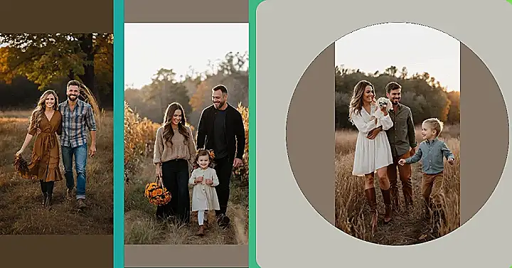 This family is totally rocking their fall family photo outfits! The colors are perfect for the season, and everyone looks so cozy and comfortable. The dad’s plaid shirt is a classic fall choice, and the mom’s green dress is super stylish. And let’s not forget the little one’s adorable brown sweater! It’s clear these parents put some thought into their outfits, and it shows in the final photos.
