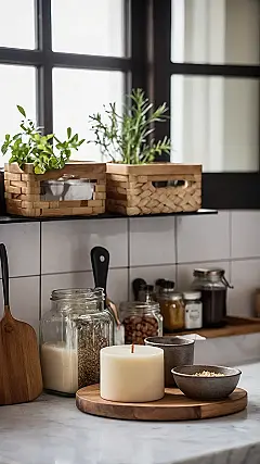 Look closely at the counter – that big, cozy candle isn’t just for power outages; it’s there to add a warm, inviting glow, making even your quick microwave ramen feel a little bit fancy. And see that cute little wooden board? It’s not just a cutting board; it’s a stylish stage for your breakfast bowl or afternoon snack, instantly upgrading your cereal game from “meh” to “masterpiece.” These little touches, like putting your nuts and grains in clear jars, make your kitchen feel less like a battlefield and more like a peaceful oasis where even cleaning up feels a tiny bit cooler. It’s proof that simple changes can totally transform your space!
