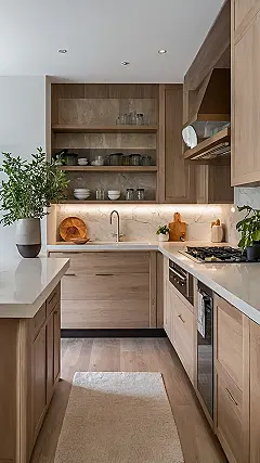 You know how some kitchens just scream, “I’m way too cool for your burnt toast and messy mornings”? This “designer kitchen” is totally one of those! Look at those super-sleek wooden cabinets and the sparkling countertops – it’s so pristine, you’d probably be scared to even make a sandwich here, let alone whip up a whole spaghetti feast. Everything looks so perfectly placed, it’s like the jars and bowls actually *enjoy* being organized, unlike the mismatched collection hiding in the back of my own cupboards.