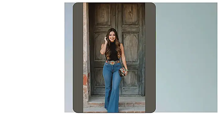 Who knew ‘rancho chic’ could look this amazing? This outfit is basically saying, ‘I can herd cattle all day, but also look fabulous doing it!’ The classic blue flare jeans and sleek black top are a perfect base, but then BAM! That incredible embroidered belt and matching clutch swoop in to steal the show. It’s got more personality than your favorite reality TV star, making you wonder if it also comes with a tiny mariachi band to play when you walk by.