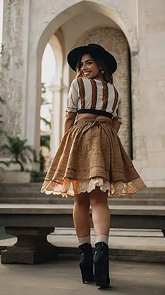 This outfit is giving us major “I’m about to conquer the world” vibes! She’s rocking a skirt that’s so flowy and comfy it looks like she’s ready for a dance party. The top is striped and cute, and the hat is totally on point. And those boots? They’re seriously cool. It’s like a mix of vintage chic and modern coolness. The whole look screams “I know I look good” and makes us want to channel our inner fashionista.