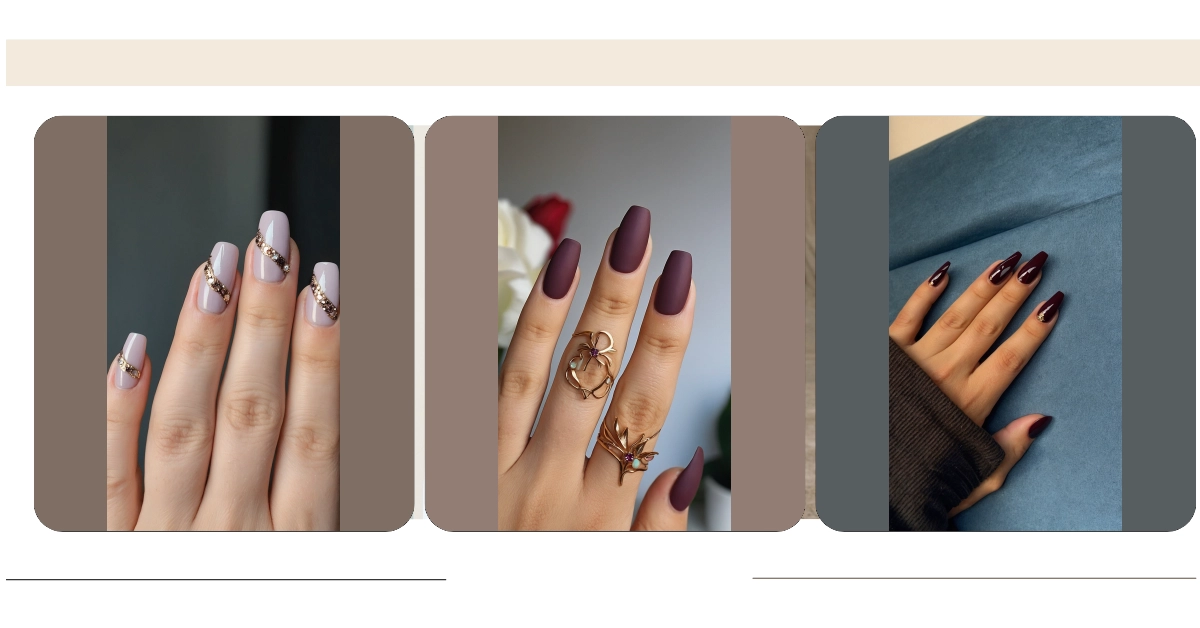 These nails are giving us all the cozy fall vibes! Just like the leaves changing colors, this manicure blends a deep burgundy with a touch of soft grey and pops of gold. They look absolutely stunning against the chunky knit sweater, almost like a beautiful autumn scene!
