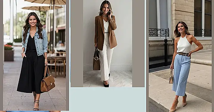 Looking for the perfect “spring outfits for women?” Check out this boss-level look! It’s like, business on the top with that sleek white blouse, but party on the bottom with those super cool, cropped blue pants. Plus, those heels? Total game-changer. You could rock this at school, a fancy lunch with your grandma, or even just strutting your stuff down Main Street.