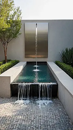 You know those walls that just stand there, looking all stoic and… well, wall-like? Not this one! This amazing outdoor wall fountain decided it was time to level up its game and become the coolest kid on the block. It’s got this super sleek metal panel, looking like a giant, shiny phone screen, except instead of TikToks, it’s dropping fresh water straight down. It’s basically the wall showing off its awesome water-pouring talent, making those little splashy bits in the pool below jump up like they’re saying, “Whee! Do it again!”