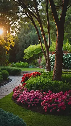 This image is like a sneak peek into a secret garden. Imagine walking along that stone path, the sunshine warming your face. You might even see a little gnome hiding in the bushes or a friendly ladybug landing on your shoulder. But the best part? Those bright red flowers! They’re like a giant “Welcome!” sign, inviting you to come explore this beautiful home garden.
