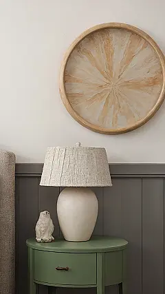 Take a peek at this wall, where a giant, circular sunshine ray seems to have landed right above a cozy-looking lamp! This isn’t just a plain old wall; it’s practically a canvas for cool room wall decor that instantly brightens the place up. It looks like something you’d find in a fancy art gallery, but secretly, it’s just trying to show off how much personality your walls can have without saying a single word. Plus, who knew a wall could look this good chilling out with some stylish gray wainscoting?