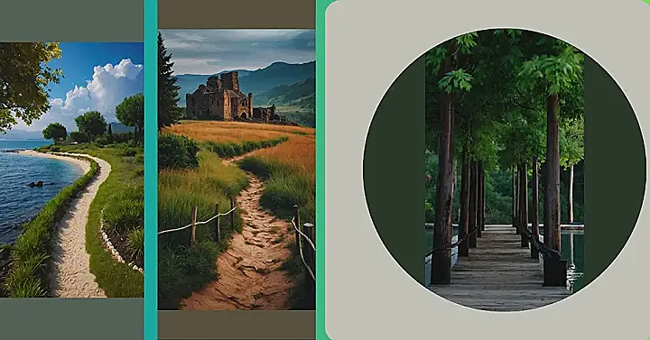 The picture shows a beautiful landscape with a winding path leading you towards a stunning view of mountains. It’s like the trees are whispering secrets, telling you to follow the path and see what wonders lie beyond! Imagine the feeling of the cool air on your face and the smell of fresh grass as you walk through this peaceful scene. It’s the kind of place where you could easily lose yourself in the beauty and forget about all your worries!