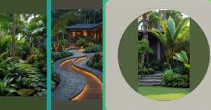 Notice those awesome wooden steps disappearing into all the greenery? It’s like they lead to Narnia, but probably just to a really stylish backdoor. And those smooth pebble paths? They’re practically begging you to skip across them, or at least look super cool while you casually stroll to grab the mail. Plus, that giant tree totally looks like it’s been holding epic secrets for centuries, offering the perfect shady spot for a dramatic selfie or just escaping the sun when your phone battery is at 1%.