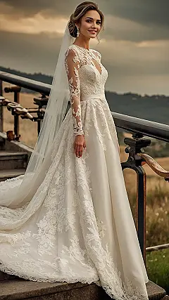 So, you want to rock that “I’m getting married but also might chill at Coachella later” vibe? This dress totally nails it! Check out all that awesome lace! It’s not your grandma’s doily collection; it’s like a bunch of fancy flowers decided to throw a wedding party on your gown. And those sleeves? Hello, comfort and style! Perfect for twirling at the reception, even if your date is your embarrassing uncle who only knows how to do the “Macarena.”