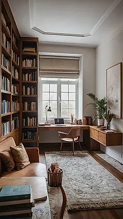 This study room decor is seriously making us question if any actual studying goes on in here. With that giant wall of books that probably hides secret passages and a couch that looks more inviting than a pizza party, it seems like the perfect place to plan world domination or just fall asleep reading. The desk looks official with a laptop ready to go, but let’s be honest, the real work here is probably finding which comfy spot is best for avoiding homework. It’s a cool setup, like a fancy library decided to adopt a living room.