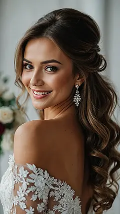 This half-up, half-down look isn’t just pretty; it’s practically genius for a wedding. It keeps her hair neatly away from her face for all the important moments (like saying “I do” without a rogue curl tickling your nose!), but still lets those gorgeous, flowing waves totally steal the show. It’s the perfect blend of classy and comfortable, meaning she can dance the night away without worrying about a hair disaster. Plus, those sparkly earrings are just the perfect little extra touch, making her look like she stepped straight out of a fairy tale without having to fuss with a super complicated updo. It’s a classic for a reason – totally chic, totally manageable, and totally ready for all the cake!