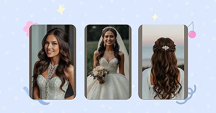 This hairstyle is like a fairytale come to life! Imagine being a princess (even if just for a day!) with gorgeous, flowing curls that cascade down your back. Half of your hair is pulled up elegantly, showing off a sparkly hairpiece that’s seriously dazzling – it’s like a mini constellation of bling! It’s the perfect mix of fancy and fun, a total win-win for any bride-to-be (or anyone who dreams of looking like one!).