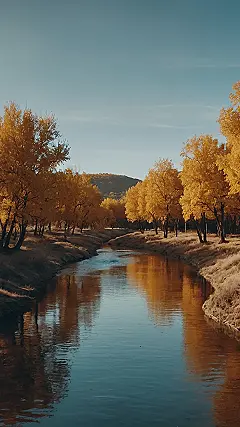 The trees are totally decked out in their best fall fashion, like they’re heading to a nature fashion show. Maybe they’re getting ready to show off their golden outfits to the river, hoping to impress the water with their beauty. Or maybe they’re just putting on a show for all the birds and squirrels who are getting ready for winter. Whatever the reason, this picture makes you feel cozy and peaceful, like you could just sit by the river and watch the world go by.