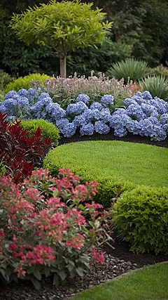 Look how awesome it looks with all those different textures and colors piled together. It’s like nature decided to throw a huge, leafy party, and everyone showed up ready to look their best. You’ve got smooth green lawn, bumpy little bushes, and those giant blue flower puffs all hanging out. It just goes to show that sometimes adding a splash of unexpected color makes everything way more interesting than sticking strictly to the rules. It definitely makes you want to find a comfy spot and chill out among all that green and colorful goodness.