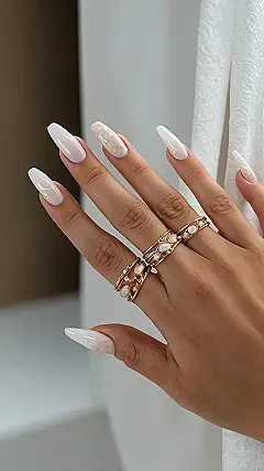 Holding your phone or just casually gesturing while talking, these nails are definitely going to get noticed! They’re the kind of manicure that looks amazing with anything, from a comfy hoodie to that super cool leather jacket peeking into the shot. While they look delicate, rocking a set of long, perfectly shaped nails like these takes some serious confidence (and maybe a little extra care when opening snack bags). Plus, those gorgeous gold rings stacked up are the perfect accessory, adding just enough sparkle without taking away from the star of the show – your absolutely fabulous, milky-white nails!