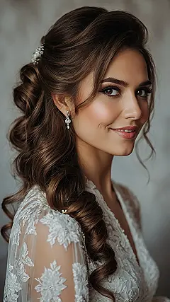 That beautiful, flowy style, perfectly parted and cascading over her shoulder, just screams ‘effortlessly glamorous,’ doesn’t it? It’s long enough to feel super special and romantic, with those soft waves that look like they’re ready for a gentle breeze, but also practical enough that you won’t accidentally dip it in the punch bowl while reaching for snacks. Plus, look at that happy smile! It’s pretty clear she’s feeling totally confident and comfortable, probably because her hair isn’t trying to do some crazy gravity-defying stunt all day. It’s a total win-win for anyone wanting to look stunning and actually enjoy their big day without feeling like their head is wearing a brick.